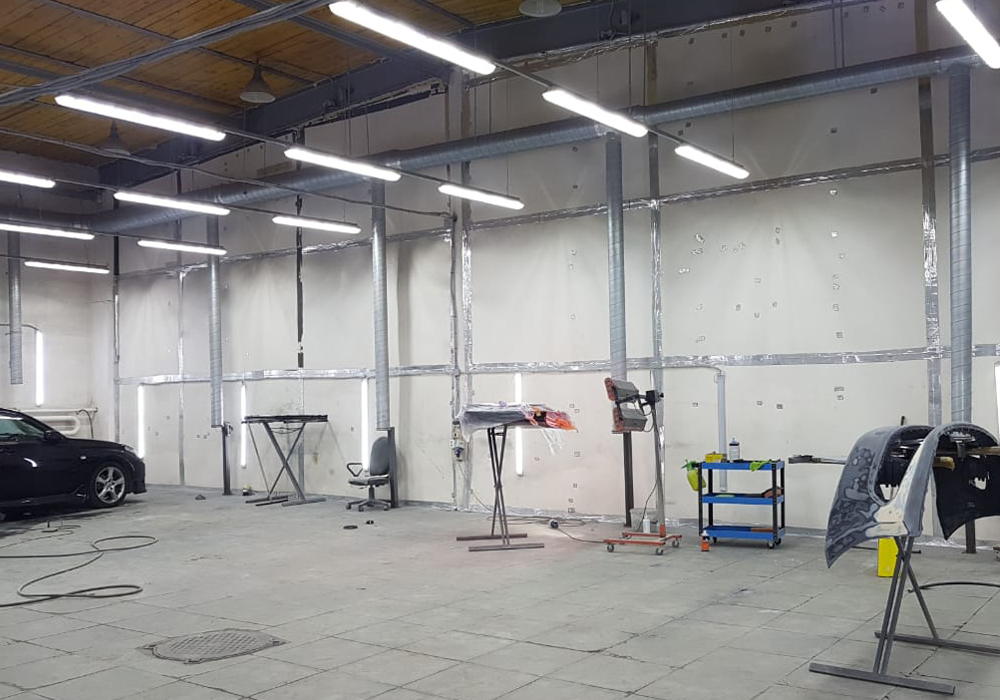 Задача: обеспечить качественное освещение территории СТО. Требуется высокая степень защиты от пыли и влаги.